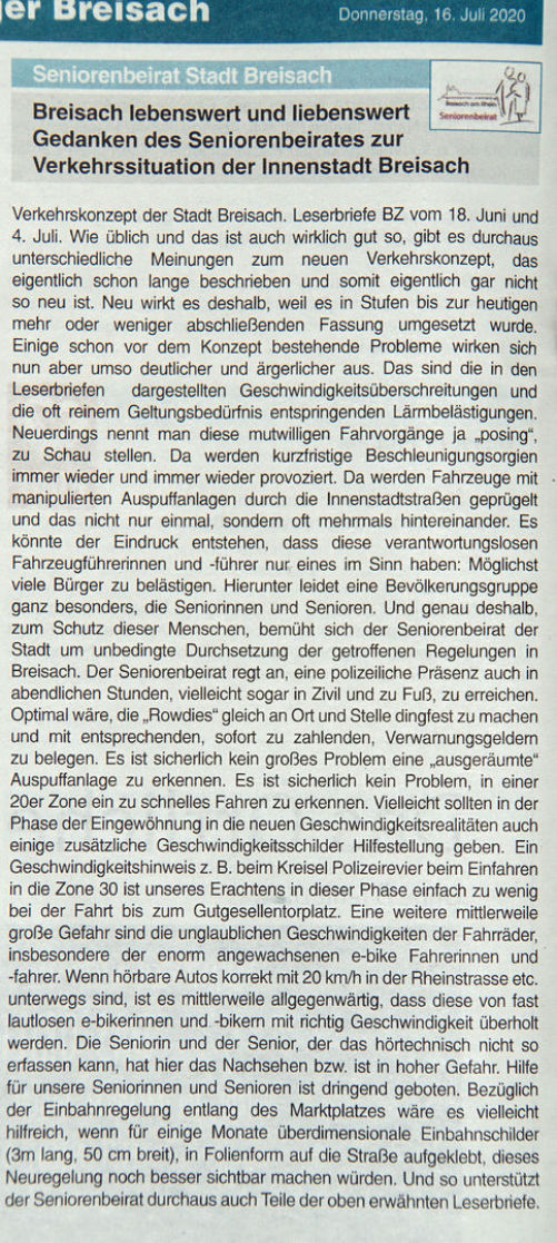 Der Seniorebeirat hat seine Gedanken und Position zum Thema Verkehr in Breisach in den Medien für Breisach veröffentlicht. Hier der Beitrag im Stadtanzeiger. Redaktionell etwas gekürzt auch in der BZ vom 15. 7. 2020.