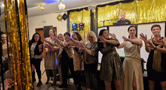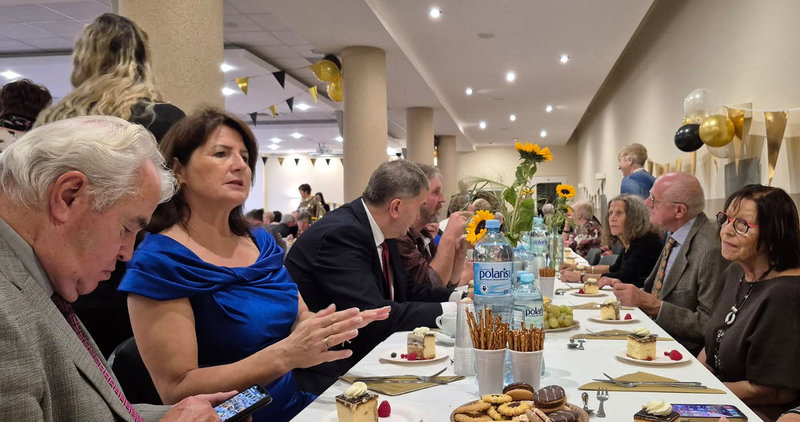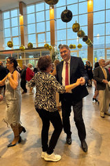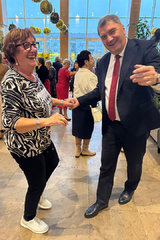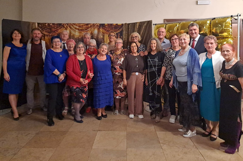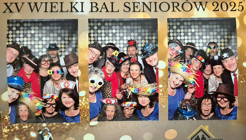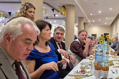 Gemeinsam noch ein Fotoshooting und verschiedenen Verkleidungen, schnell wechselnd, da innerhalb 3 Minuten drei Bilder gemacht werden. Viel Klamauk und Spaß, anschließend noch vor der goldenen Hallendeko gemeinsame Bilder mit Gastgeber und Gästen samt Stadtpräsident und Frau. Die Beiden waren bis zum Ende um ca. 20:30 h mit bei uns am Tisch und haben mit den Senioren gefeiert.