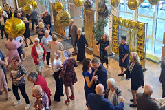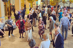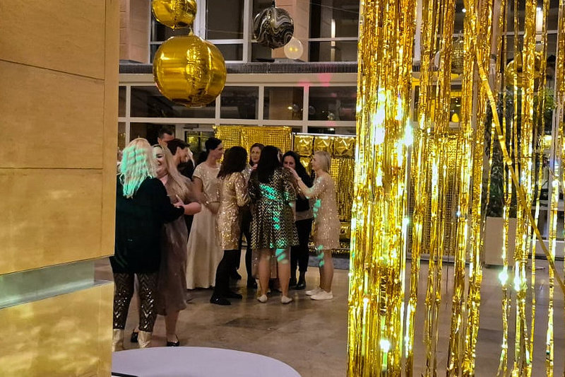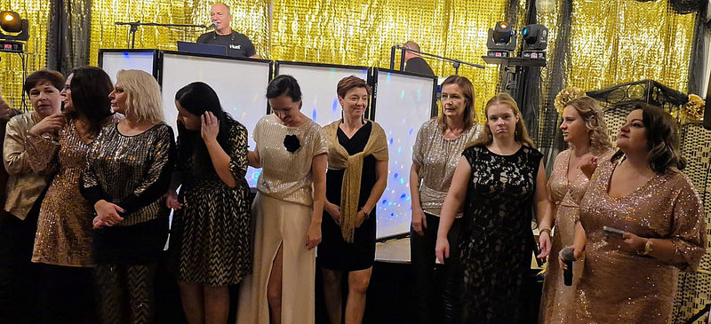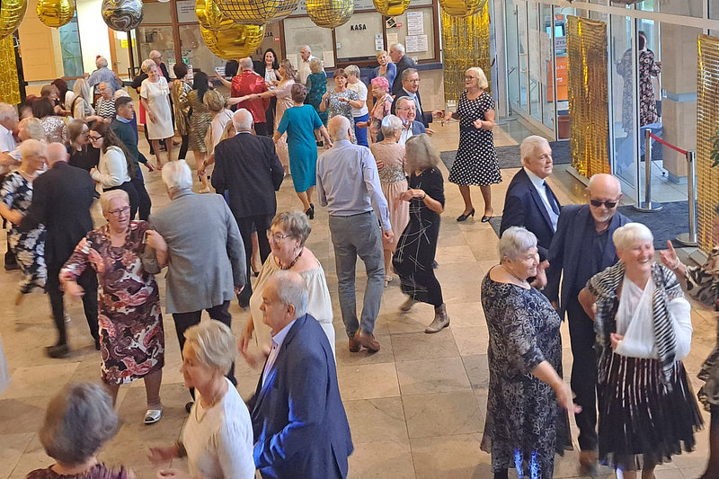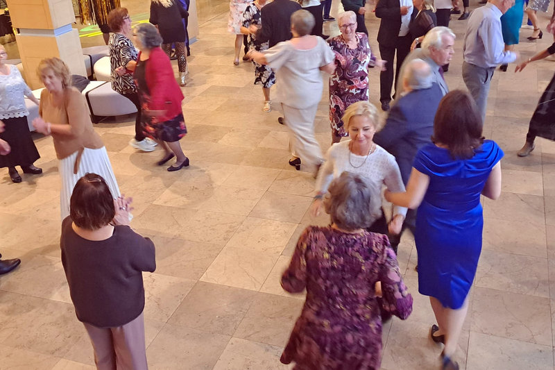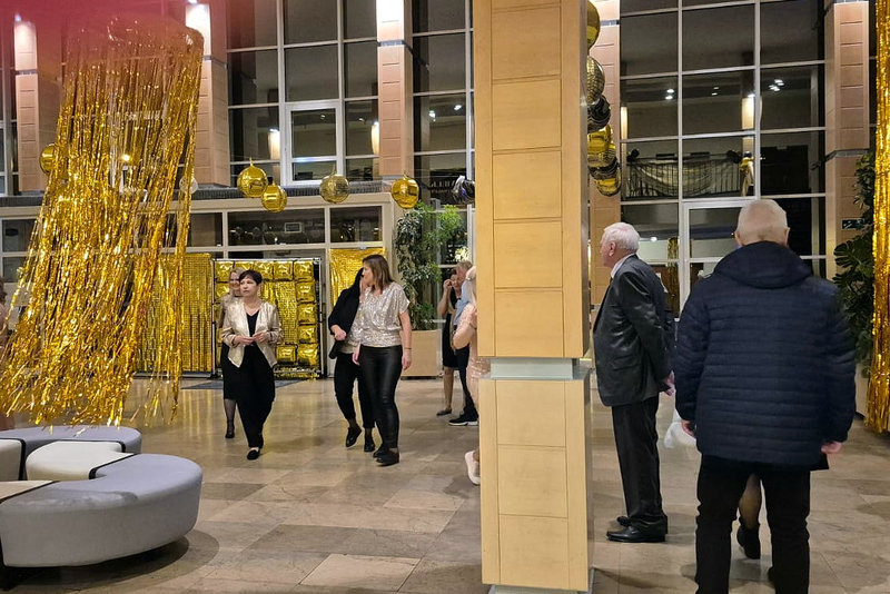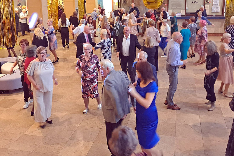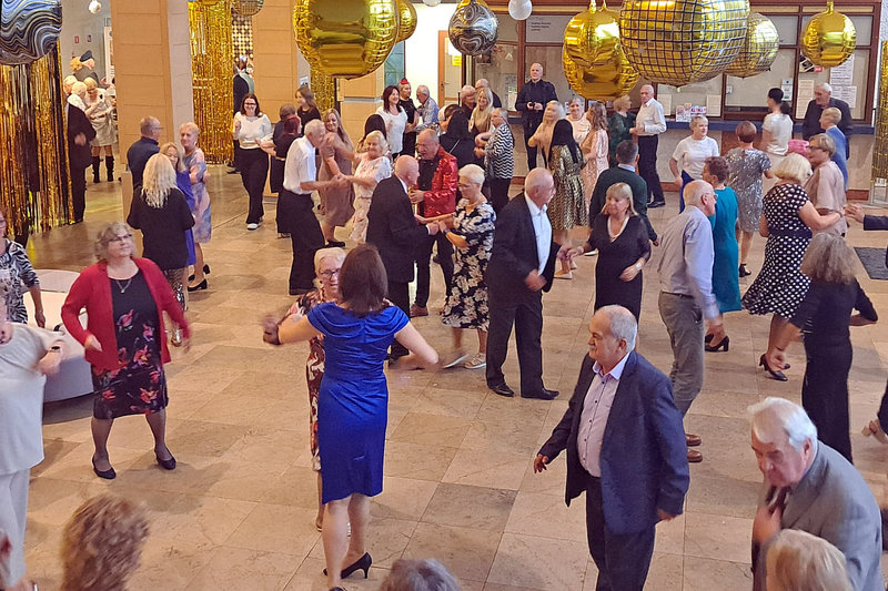 Im Foyer baute sich eine 5 Mann –Kapelle auf, die alsbald zum Tanz aufspielte und die Seniorinnen und Senioren machten fleißig Gebrauch von der Tanzfläche. Polonaise, und allerhand weitere Vergnügungen. Das Foyer war festlich mit Goldgirlanden und hübscher Golddeko geschmückt.