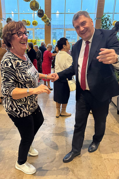 Zurück zum Hotel, Geschenke holen…. und schon düst der Bus mit uns in eine Vorstadt zu einer Gemeinschaftswohnsiedlung. Hier werden wir schon erwartet. Herzliche Begrüßung durch die Seniorinnen und Senioren und einer polnischen Trachtenkapelle. MM lässt es sich nicht nehmen, hier den Schellenbaum zu spielen Auch hier war wieder der Stadtpräsident mit Gattin anwesend und mitgefeiert bis um 21 Uhr.