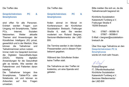 Auch für den kommenden Gesprächskreis gibt es interessante Themen. Wie zuletzt schon bemerkt, ist KI ein aktuelles Thema in allen Medien. Gerne möchte ich mich mit Ihnen auch darüber unterhalten. Insbesondere geht es dabei darum, wie weit KI schon in unserem Alltag stattfindet. Auch gibt es interessante KI-Anwendungen, die bei der Pflege zuhause sehr hilfreich sein können.